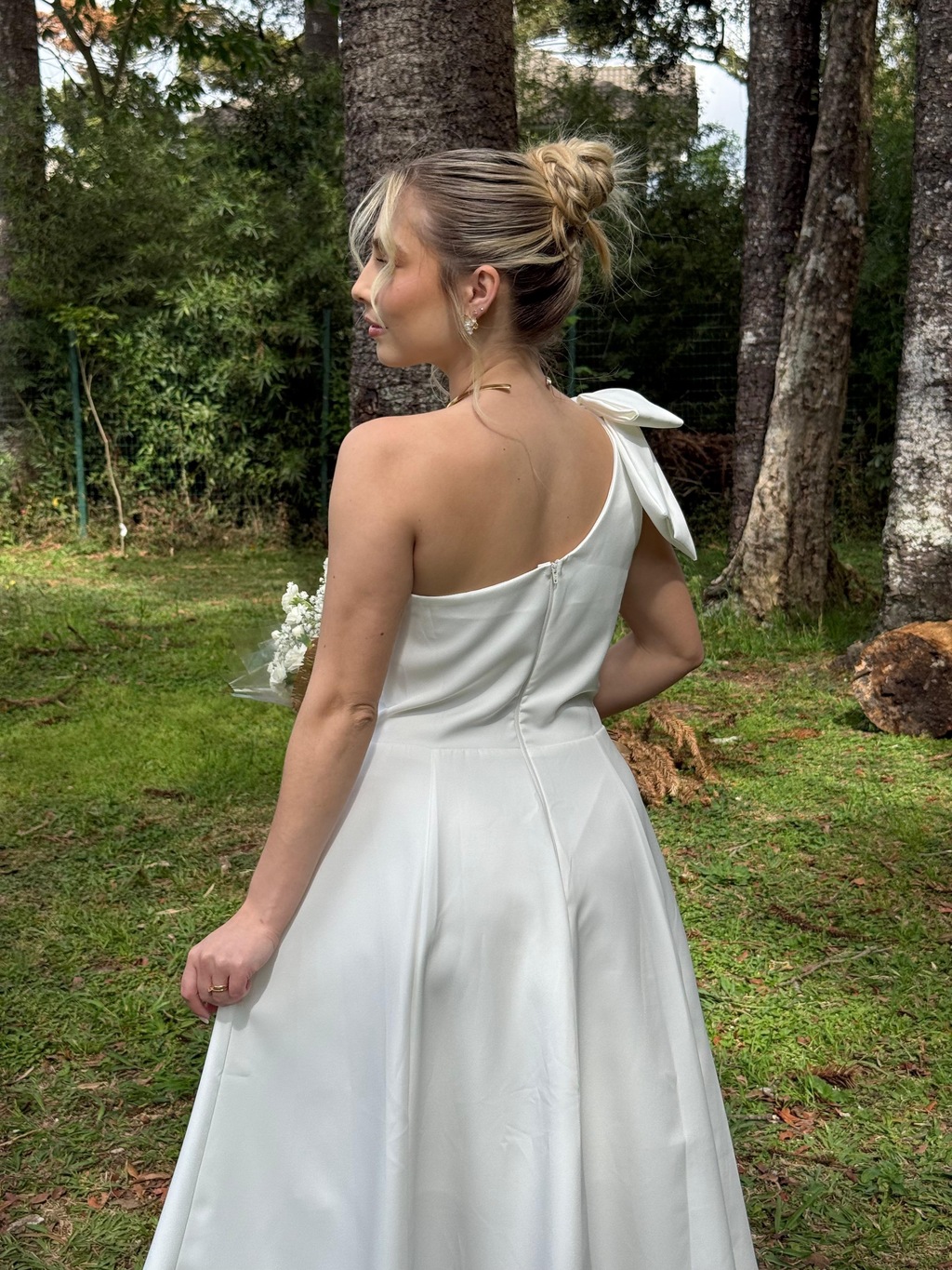Vestido branco em 100% Poliéster, com caimento impecável e detalhe no ombro que traz ainda mais charme e modernidade ao look.