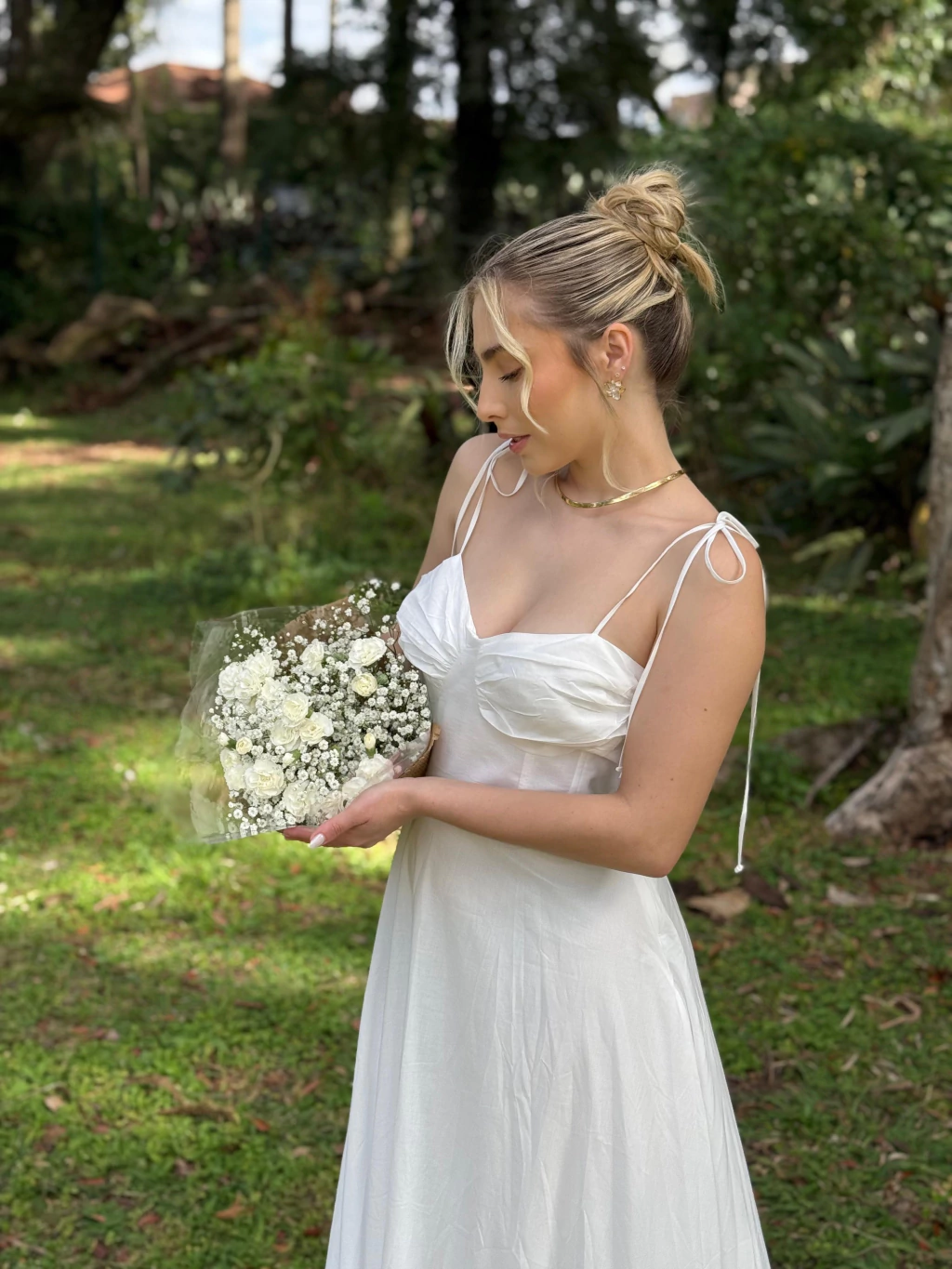 Com design romântico e caimento leve, esse vestido longo é ideal para marcar um dos momentos mais especiais da sua vida. As alcinhas finas trazem delicadeza, enquanto o detalhe no barrado garante movimento e charme extra.